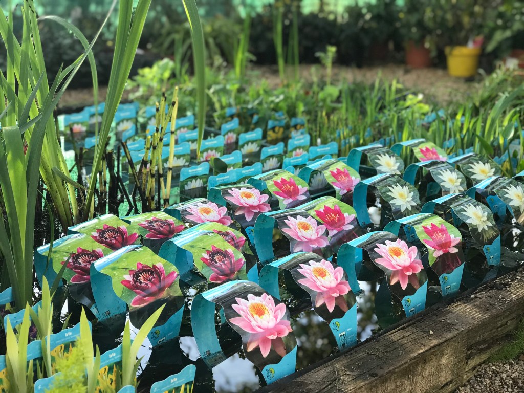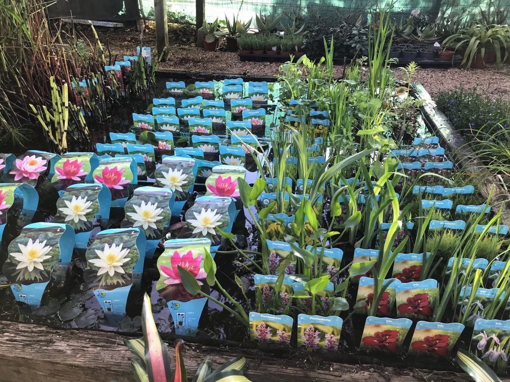We have plants for the deeper areas of the pond such as Nymphaea and plants for the border like Pontederia, Equisetum, Iris, etc.